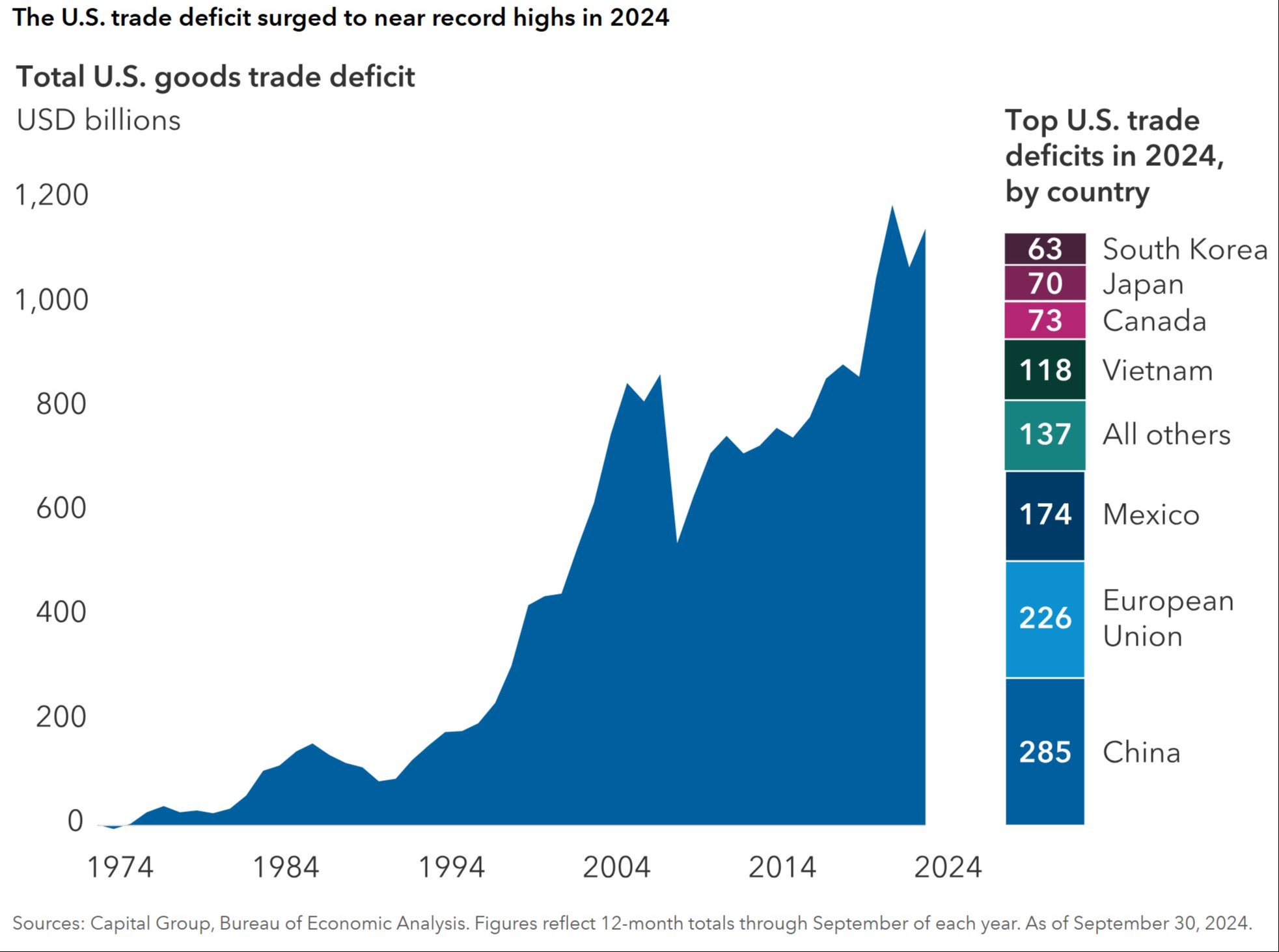 If there’s one number to know about tariffs, it’s the U.S. trade deficit for goods. That figure hit $1.1 trillion in 2024 as Americans bought imported products, and a strong U.S. dollar weighed on exports. In fact, the U.S. has run a trade deficit every year since the 1970s.
