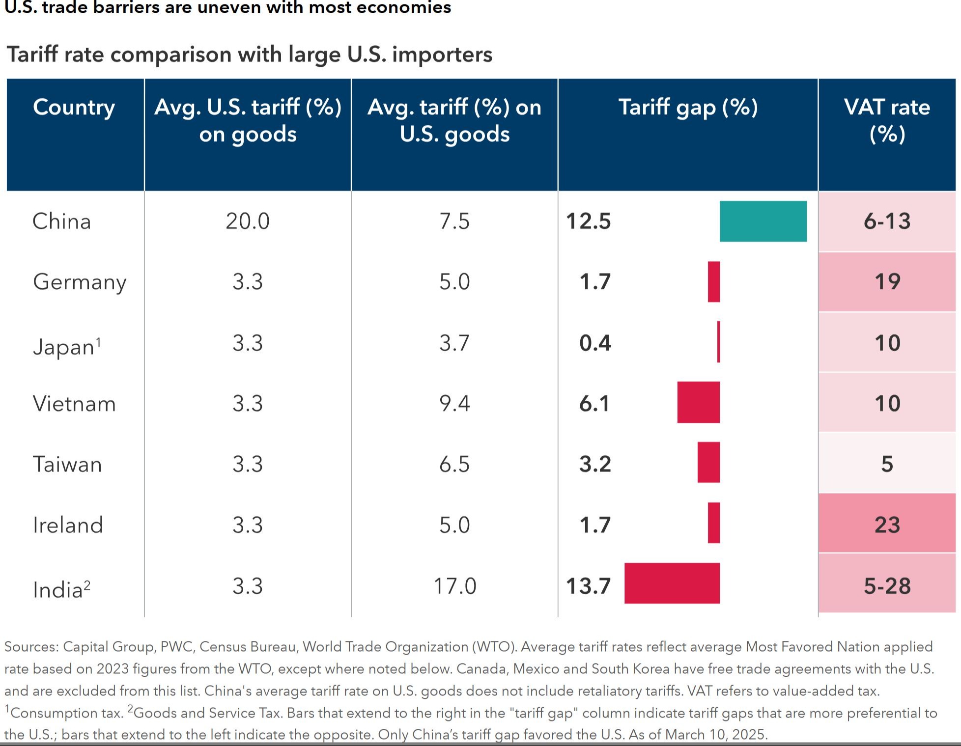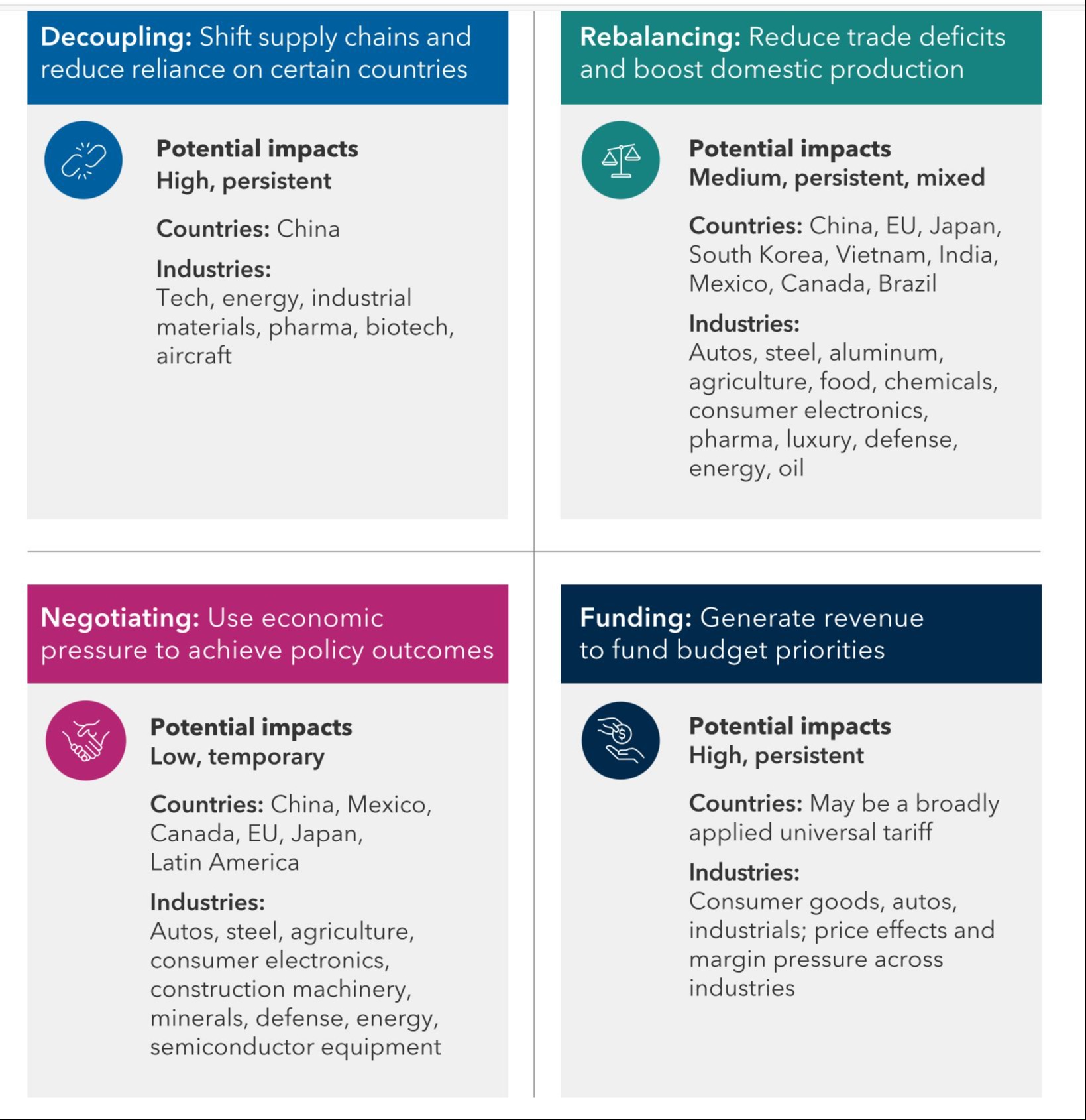 There are four primary motivations for tariffs today and each has its own impact on the investment environment, highlighted in the chart below provided from our friends at the Capital Group. (1) Decoupling, which is shifting supply chains to reduce reliance on certain countries, such as China. (2) Rebalancing, which is about reducing trade deficits and boosting domestic production. (3) Negotiation is using economic pressure to acheive Trump's goal for policy outomes, and (4) Funding, which is about generating revenue to fund government budgets. Each are independent issues and will influence how the story plays out. For instance, tariffs used for negotiating purposes are unlikely to persist over long periods of time while those that are part of a larger decoupling process could be here to stay.