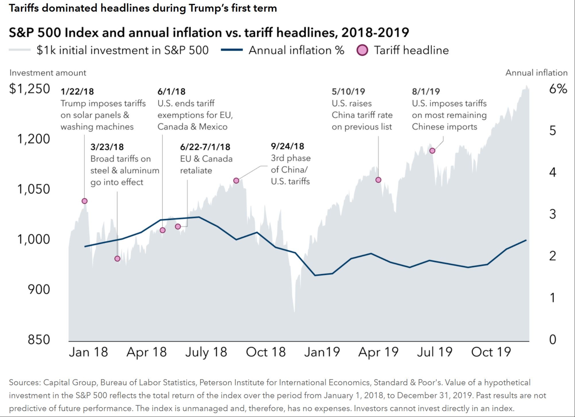 The first Trump administration pursued a similar goal of reducing the trade deficit by imposing tariffs. That move sparked a trade war that whipsawed markets and dominated the news, much like now. But it was temporary. In hindsight, the impact on inflation was muted in the aggregate, with the annual Consumer Price Index ranging from 1.50% to 2.85% in 2018 and 2019. The S&P 500 Index declined in 2018 but rallied sharply in 2019, both years driven by many factors other than tariffs.
